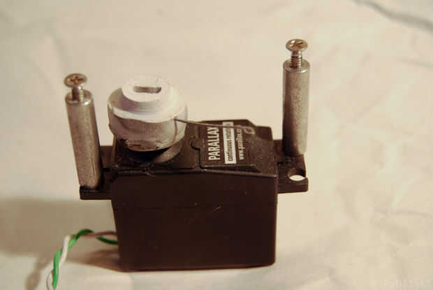 utilicé un viejo servo parallax que tuve en mi cubo de piezas. Este servo pequeño es más que suficiente para girar el pestillo. Con el fin de conectar el servo en el eje de bloqueo usé masilla epoxi. Masilla de epoxy es muy fácil de utilizar y es extremadamente versátil. El cable que ves asomando de la masilla se utilizará como el brazo del interruptor de límite.