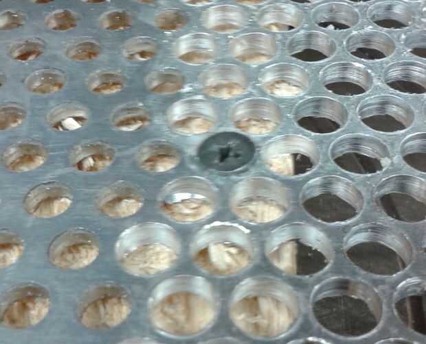 Utilizando uno de los agujeros en un extremo de la placa de aluminio, había fijado a un bloque de madera con un tornillo de la mampostería seca. Coloqué el tornillo en la línea central, en el extremo del bloque más cercano al extremo más lejano de la parrilla. Voy a explicar por qué más adelante.