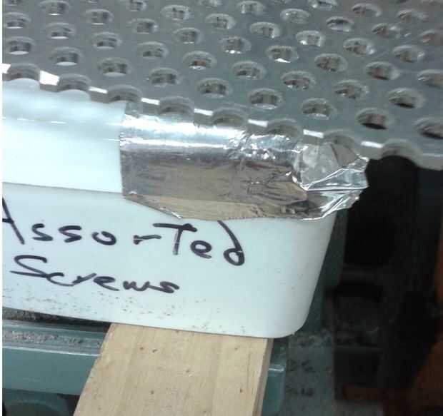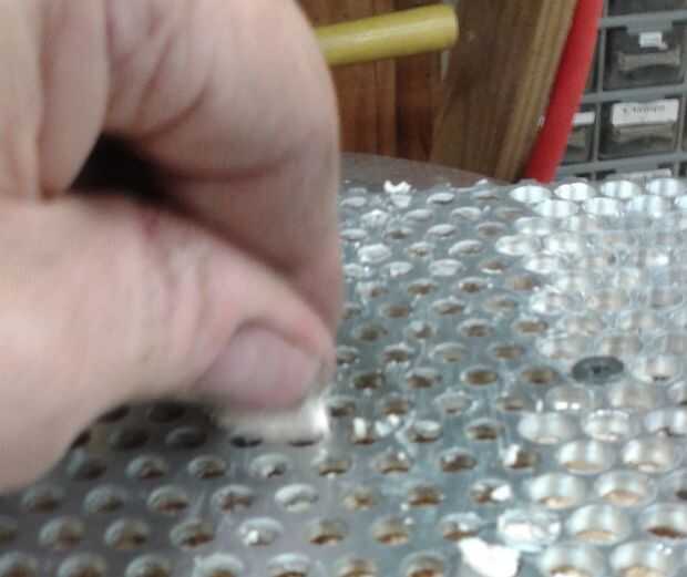 Y usando a una vieja lata de cera dedicada a proyectos brillantes coche no. Me corte un bloque de la materia hacia fuera y extender sobre la placa de aluminio en la zona que estaba a punto de perforar. Usted sólo necesita asegurar que una pequeña cantidad de cera se afeita y termina dentro de los agujeros, a lo largo del borde, o como un bulto dentro. También se podría utilizar el aceite, pero la cera es más fácil de aplicar, limpiar y mucho menos desordenado (si utiliza aceite para cubrir la mesa de la sierra y otras herramientas de la tienda, usted encontrará que con el tiempo, vuelve el acero negro. La cera es mejor. Protege de la corrosión, lubrica la cama y permanece limpio. Me lo agradecerá por esto más adelante).
