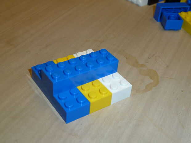 Conectar los tres ladrillos del paso anterior transversalmente con un solo ladrillo de 2 x 6. Esto completa la base.