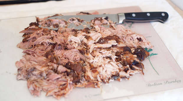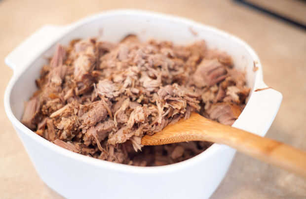 Romper sus pinzas de la parrilla y sacar la carne de cerdo de la olla. Le Tire justo al lado del hueso.