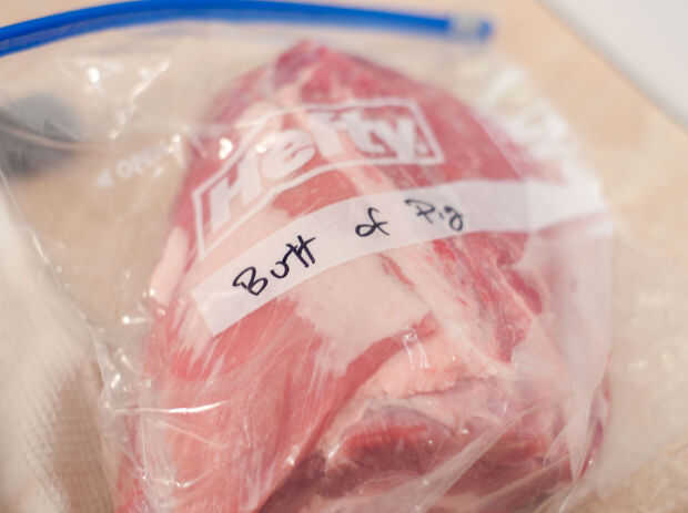 Tomar el hombro puesto en una tabla de cortar con una toalla debajo de él. Cortarlas por la mitad. Uno va en la olla - el otro va en una bolsa de congelador tamaño galón y luego en el congelador.