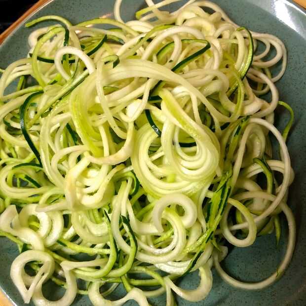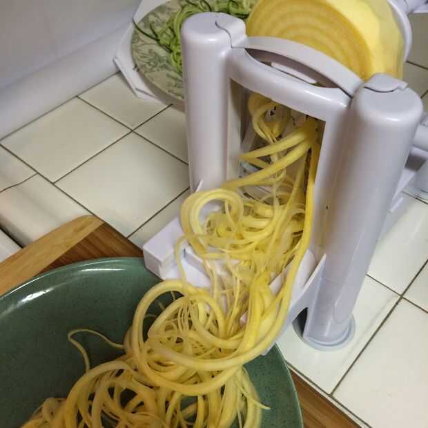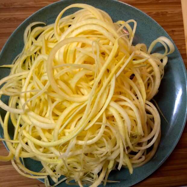 Mencioné que esto sirve cuatro, y sé que estás pensando "un colinabo y un calabacín no recorrer..." Se sorprenderá de cuánto tallarines sale un colinabo. El calabacín es suave y fideos fácilmente, mientras que el colinabo, siendo más grande y un poco más sólido, requiere un poco más ronco y el apoyo de la Spirooli. Tómese su tiempo, no quiere romper en el primer go!