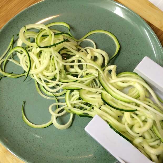 Las fotos de arriba muestran el colinabo y calabacín "noodled" con el Spirooli. Las zanahorias, estar demasiado delgada para el dispositivo, se pelan en tiras por separado con un pelador de verduras.
