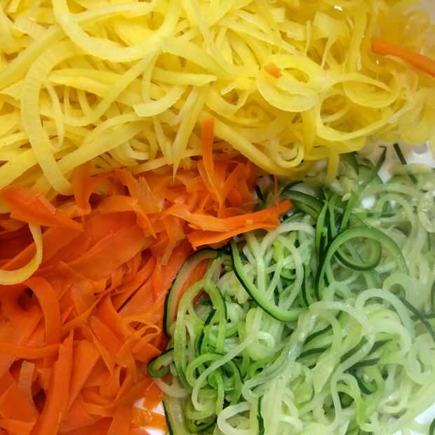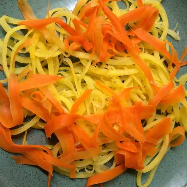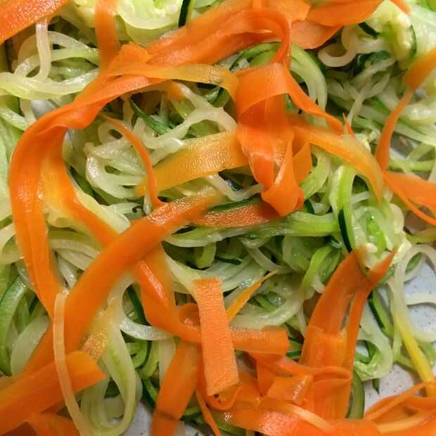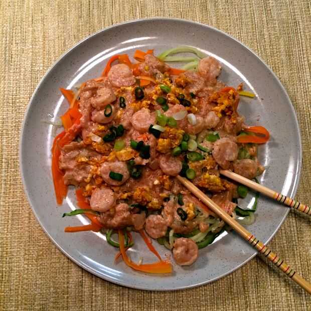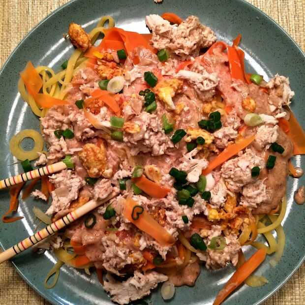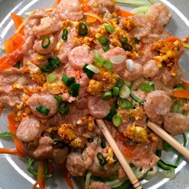 Mezclar los fideos de verduras cocidas, divida en cuatro platos. Cuchara la salsa sobre los fideos. Puede desea la mezcla en el pollo o camarones con la salsa para las carnes cubiertas en su totalidad, o añadir el pollo/camarón después de la salsa sobre los fideos. Espolvorear o mezclar el revuelto con cebolla y servir.