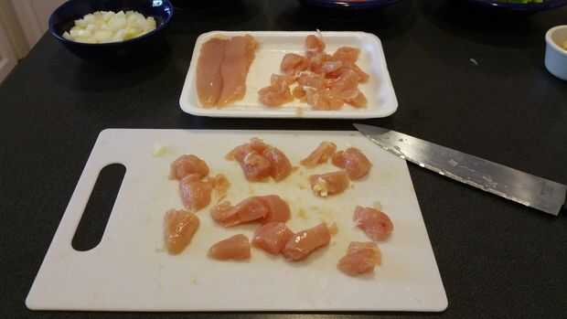 Preparar los filetes de pollo cortando cuidadosamente uniforme, 1 pulgada pedazos. Asegúrese de utilizar una tabla para cortar diferentes que la que se utiliza para cortar verduras para evitar la contaminación cruzada.