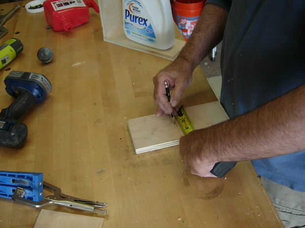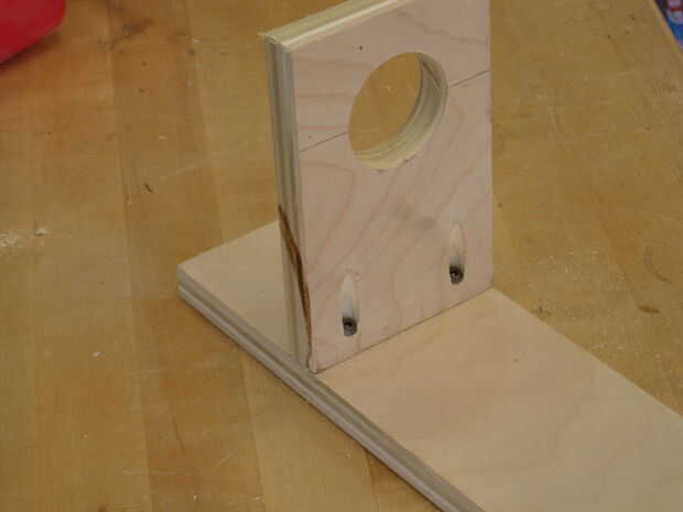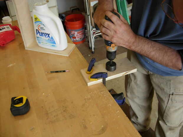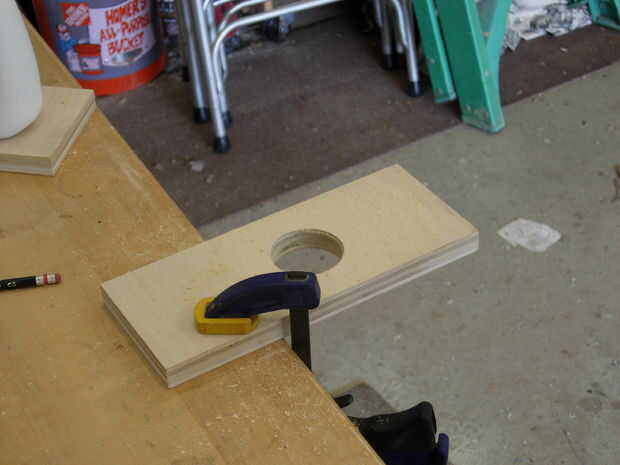 Ahora sujete la pieza a algo sólido y hacer el agujero para el cuello de embudo con el 2" agujero vio. Si cuando la broca guía penetra en la parte posterior y voltear la pieza para terminar el agujero, eliminas mucho la fragmentación de la sierra.