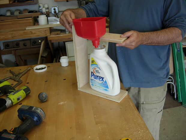 Conectar el embudo a la pieza posterior para comprobar la altura y la relación del embudo a la botella. Quería que el final del embudo en la botella para eliminar goteos. Marque la ubicación. También marca el centro del cuello de embudo donde pasará por el titular del embudo y donde cortar la parte sobrante.