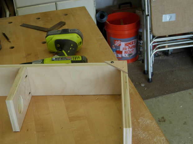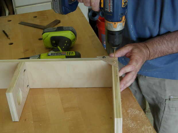 Aunque la unidad es bastante fuerte como es, una función de los tornillos de bolsillo, decidí agregar algunos refuerzos pequeñas hechas de madera contrachapada de 1/4", para reforzar las esquinas. Son perforados y luego atados con los mismos tornillos de bolsillo que se utilizan para el resto del proyecto.