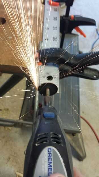 • herramienta rotativa con disco de corte (también podría trabajar una sierra para metales o lámina de metal rompecabezas)