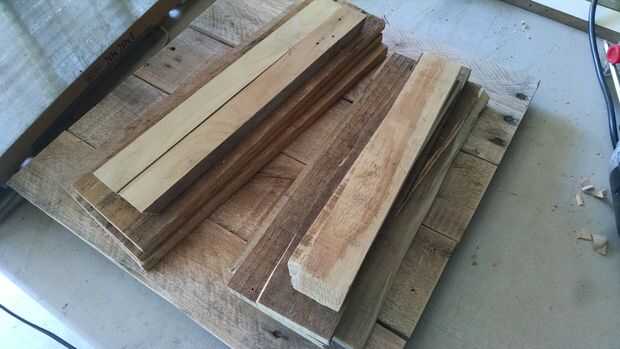 Usé mi sierra de mesa para cortar algunas tablas de palet en tiras delgadas, de una pulgada de ancho. Estas se utilizarán para unir cada estante. Se necesita dos para cada estante cortar a la longitud de cada estante.