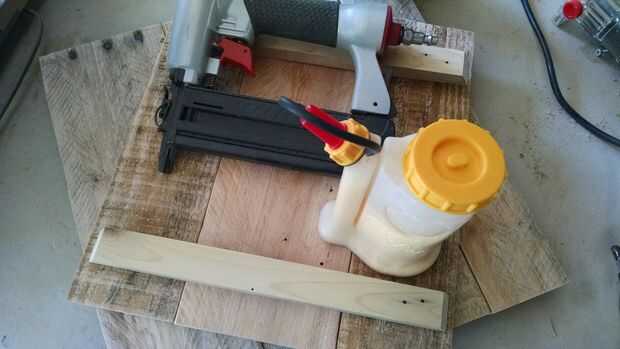 Luego utiliza una de las tiras pequeñas, aplica pegamento a un lado y colocarla en el estante inferior, que actualmente tiene la parte superior hacia abajo. He utilizado la grapadora de aire para poner al menos dos grapas en cada tablero a través de la estrecha franja, esta mantenga juntos mientras el pegamento seca. Si cualquier pegamento exprime hacia fuera trapo lo para arriba en el con un trapo húmedo, serán fácil de limpiar ya que después de que se seque.