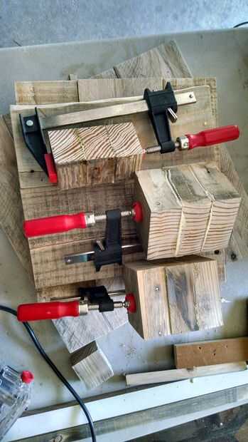 Luego me mudé a los bloques de cuadrados verticales. Pegué tres cuadras con abrazaderas para mantenerlos en su lugar mientras el pegamento seca. También puede usar tornillos para esto. Esto se repitió para el segundo elevador así.