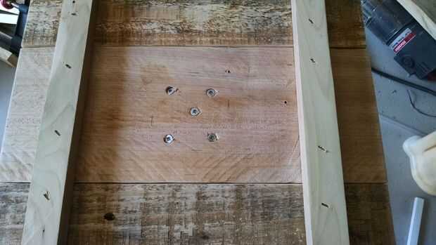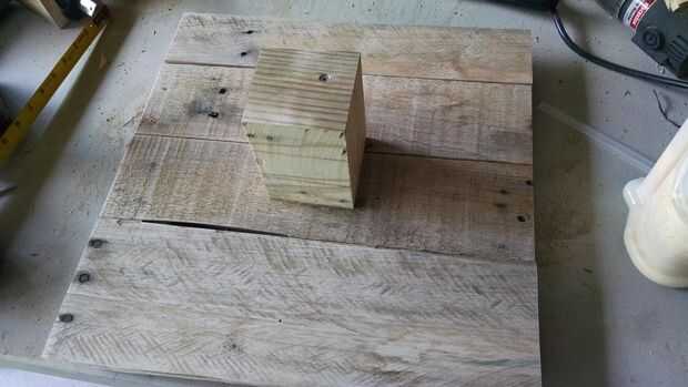 Determina el centro de la plataforma con la canalización vertical en el lugar. Celebró los dos juntos mientras que los bancos más, descansando sobre la mesa boca abajo. Me medidos precisión luego agujeros antes de enroscar por la parte inferior de la plataforma para arriba en la canalización vertical.