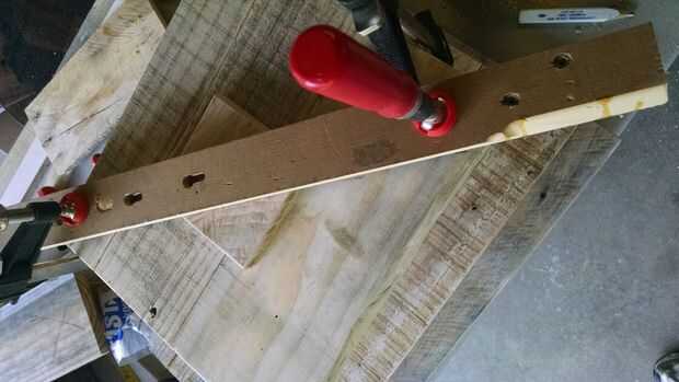 Para presionado mientras el pegamento seca, usé un trozo largo de madera para cubrir la distancia y afiáncela con abrazadera en los bordes exteriores de la plataforma. Esto funcionó bien ya que no tengo una pinza hacia atrás lo suficientemente lejos. Sólo no apriete en exceso las abrazaderas ya que demasiada presión se levante las esquinas de la plataforma.