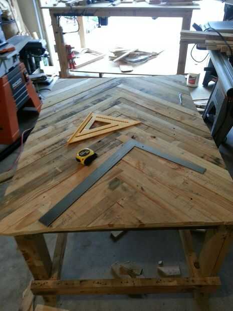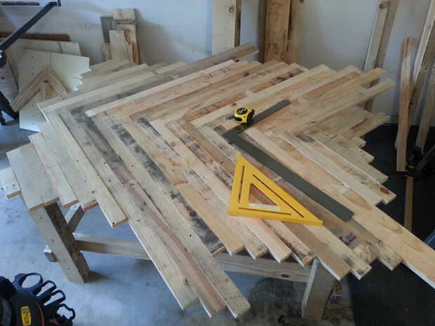 • Una vez que el punto central fue que empecé mis listones se establecen. Quería la tabla para mantener un estilo muy rústico por lo que no plano estas tablas en ambos lados. Justo al lado de uno, así que descansa plano sobre la parte superior de sub. Comencé el patrón en la parte superior utilizando un cuadrado de la velocidad registrado contra el extremo de la mesa y una plaza de estructura se usa para obtener ángulos de mi derecha. Una vez que encontré la forma correcta para el patrón que ha establecido mi primer listones y clavado en su lugar.