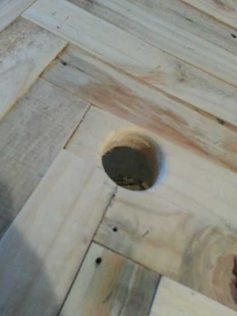 • Utilizando un serrucho que acomodaría el tamaño de la sombrilla he encontrado qué pensé era aproximadamente la mitad de la tabla. Me perforó un agujero a través de la tabla y redondea los bordes con una lijadora de Palma. Después de esto se hizo pasé un poco de tiempo con la lijadora de Palma llegar las tablas a ser bastante uniforme. No quiero que sea totalmente plana y uniforme porque quería que tuviera un aspecto rugoso con un bonito acabado en él.
