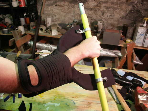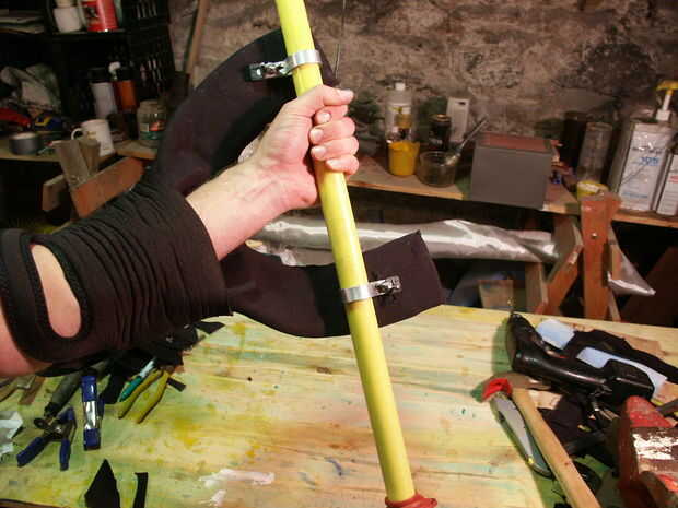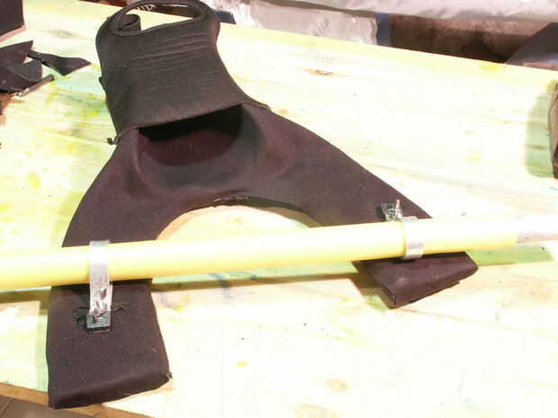 Por lo tanto, esto está diseñado para trabajar con la fibra de vidrio Vara y la cuerda de amortiguador auxiliar como se ve en la foto primera. La ventaja de thie desing sobre ambos el original y la primera revisión es que esto permite al atleta a levantar la pala fuera del agua lejos del casco (fallo del segundo diseño es que es como una catipllar pista en movimiento) sin embargo esta mantiene la hoja a los 90 a la dirección del recorrido,