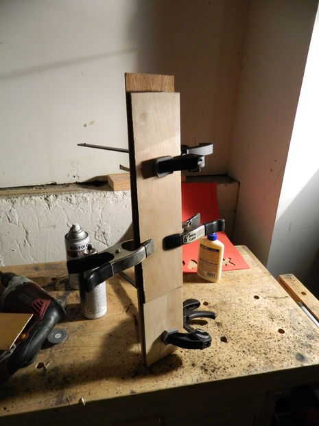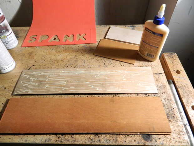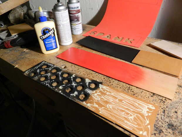 Tiempo para una capa de la madera! Lado negro del pedazo perforado debe mirar hacia fuera. Poner el tablero rojo detrás de él para que pueda ver el rojo a través de los agujeros. Vuelva a colocar la otra pieza negra frente a la otra forma tal ves el negro a través de las letras de corte de la espuma. Poner la última pieza corta de madera en la parte inferior del frente a añadir una capa más a la manija para que coincida con el grosor de la espuma.