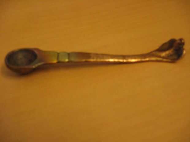 3) climatizada la cuchara abolladura en un gas para 3-4 minutos, tengo la cuchara en paño de algodón grueso y mojado