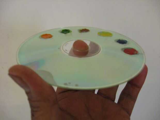 7) puesto que CD tiene un orificio central, perfectamente puede sostener esto como una paleta y uso agua colorante (broche de presión-1)