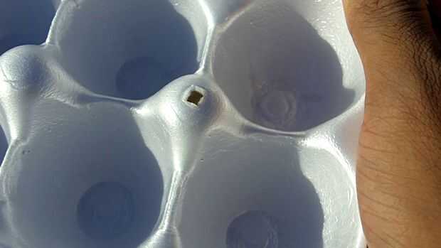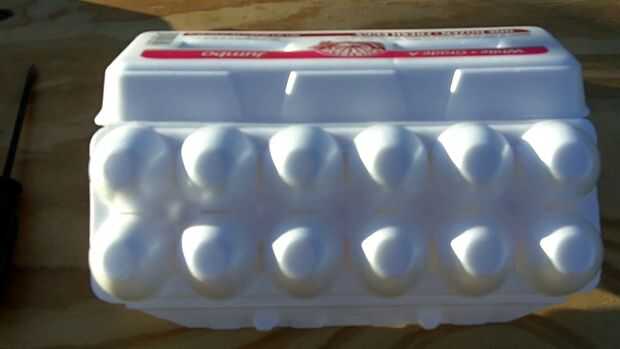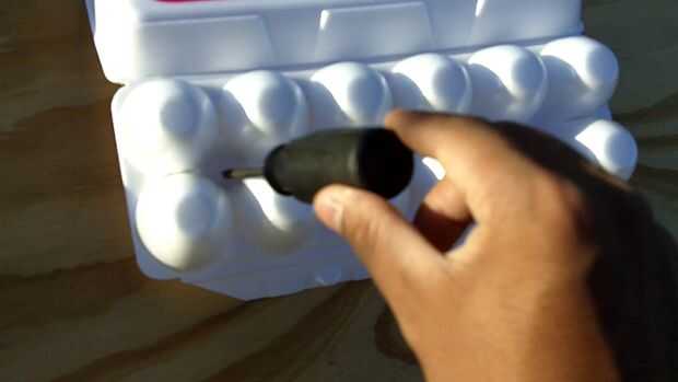 Abra la caja de huevo y darle la vuelta boca abajo. Encontrar el punto medio entre el huevo. Toma tu destornillador y hacer un agujero en esa zona.