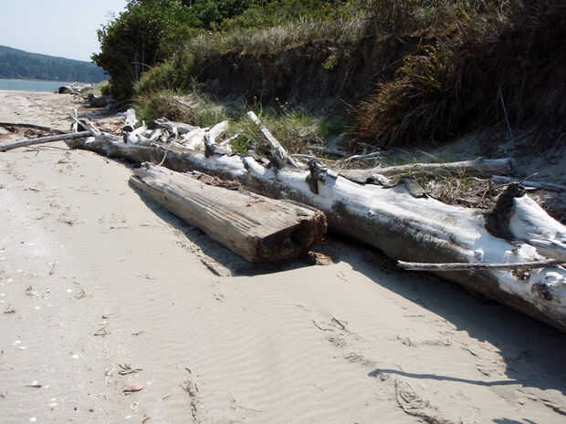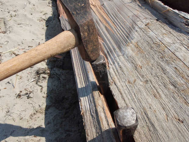 El desafío era el registro tenía un lado plano agradable posición 90 grados desde donde yo quería. No podía manejar las cuñas hacia los lados para dividir fácilmente. Comencé a cavar hacia fuera la arena con las manos para obtener el registro a rodar. Entonces me golpeó si este registro enrollado me podría prender a la tierra. Podría ser que hasta la próxima marea alta o peor. Me abandonó ese plan y empecé conduciendo cuñas para partir de una tabla en el lado con un montón de nudos.
