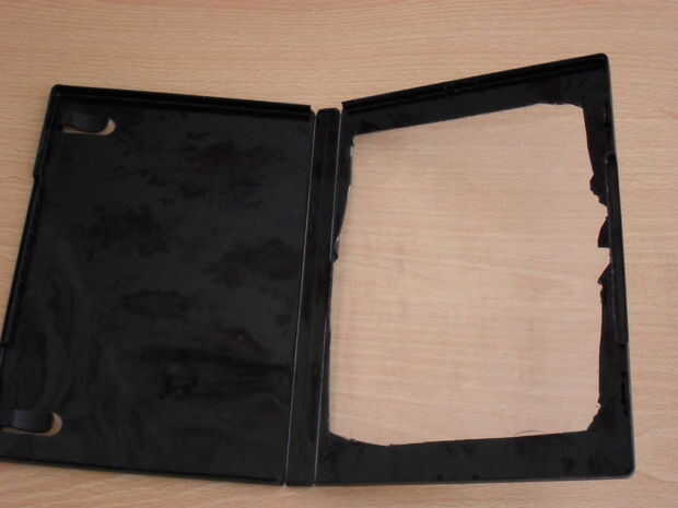 Comenzar con una caja vacía de DVD. Retire la funda de papel impreso de la cubierta exterior transparente. Use fuertes tijeras o un cuchillo (este es el paso más difícil) para recortar un marco desde el lado con el DVD. Yo le aconsejo que tener realmente cuidado o pedir a alguien para ayudarle. Luché con este paso yo. Asegúrese de que usted no corte a través de la cubierta exterior transparente.