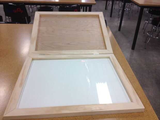 Una vez que los 2 lados se atornillan juntos mediante bisagras todos que tienes que hacer es el palillo de su vidrio en! Decidí poner una capa de cartón con un trozo de papel blanco en la parte superior y luego mi vaso. Esto simplemente da el vidrio perdón un poco, y ya que generalmente comenzar una pintura sobre una superficie blanca quería mis colores contra un blanco de la mezcla. Algunas personas poner 50% gris papel en su lugar, o marrón de papel si lo hacen mucho en pinturas.