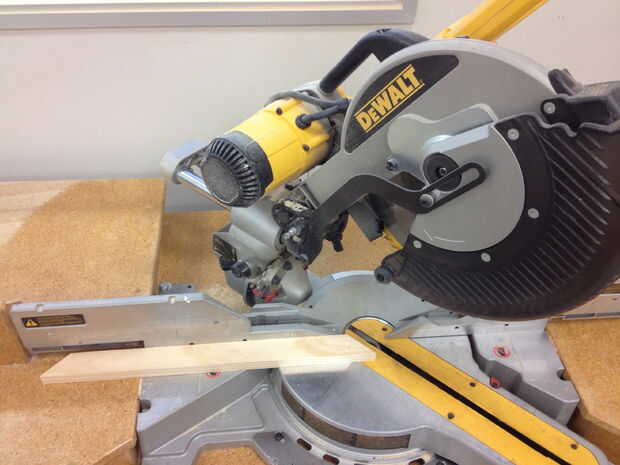 La forma más sencilla de hacer esto es establecer la chuleta de inglete sierra a un ángulo de 45 grados, establecer una parada, cortar la madera y luego Dale la vuelta. y el otro lado