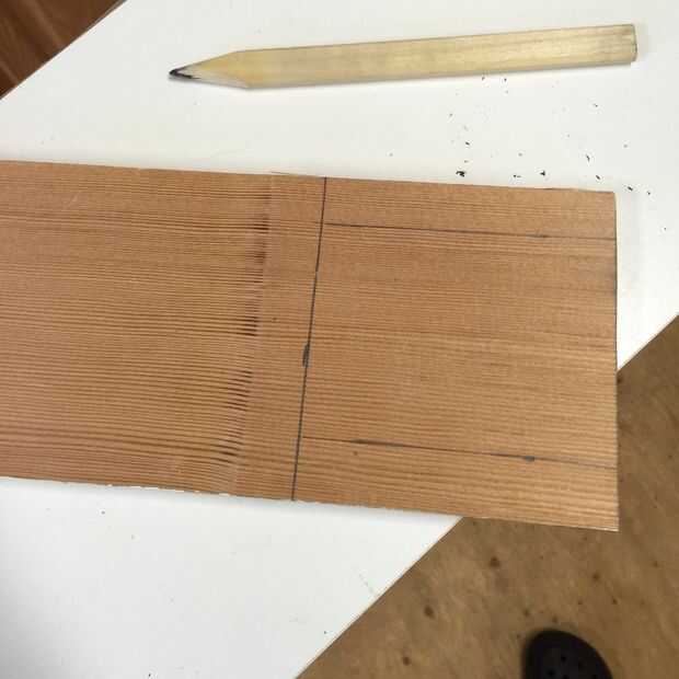 Trace una línea a través de la Junta, 4" desde un extremo y dos líneas más 3/4" en cada lado, desde el mismo extremo de la tabla hasta la línea. Esto describe y centros el espacio que se cortó la rueda de paleta, dejando las piernas de 3/4 de pulgada en cada lado (Foto 1).