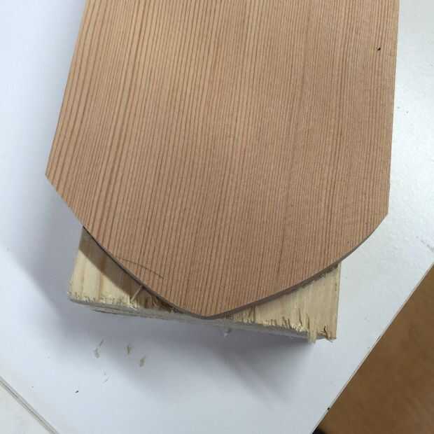 Encontrar el centro del otro extremo de la tabla y marca una curva desde ese punto a cada borde, 1 1/2" a cada lado. Esto formará la proa de su barco (Foto 2).
