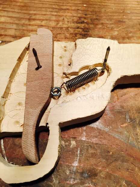 Todo lo que tenía que hacer es hueco otro pequeño canal perpendicular a la primera de ellas. Usar esto como un canal para la primavera. Entonces enrosca el tornillo de ojo cerca de la parte inferior del gatillo, pero en un lugar que se oculta por el cuerpo. Asegúrese de que usted haga el canal lo suficientemente largo como para que usted puede poner algo de tensión en el resorte.
