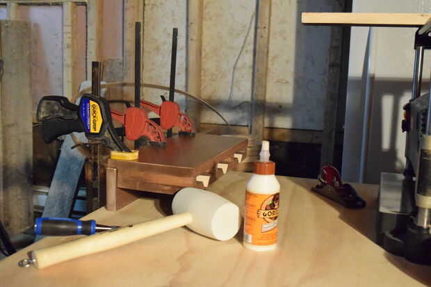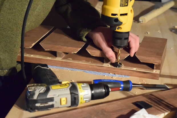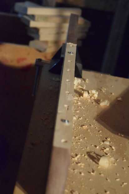 En el borde de la 29" pieza donde hay cinta, ahora puedes quitarlo y empezar a hacer orificios para taquetes. La primera en 5/8" del borde, luego cada 2" después de eso hasta llegar a 8 agujeros. Sabes la rutina por ahora, así alinee con los sostenedores de cristal que acaba de terminar, espiga y pegamento duro. Hacer esto para ambos estantes.