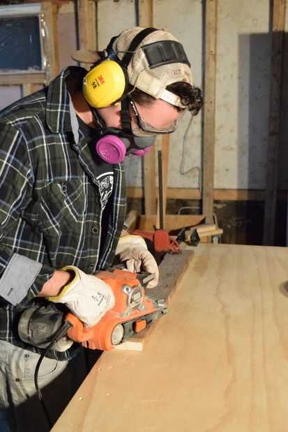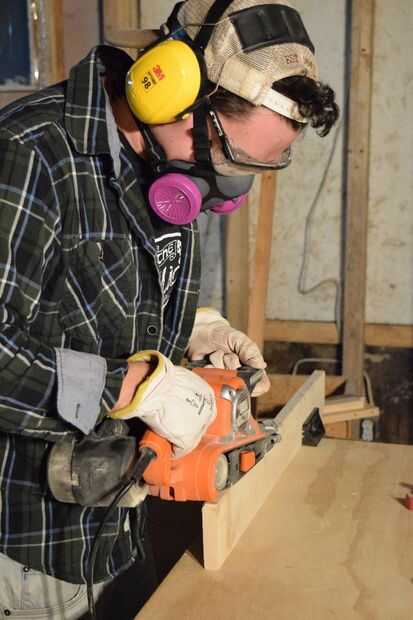 Sacar la lijadora de banda. Poner en el respirador, gafas y guantes. Usar protección auditiva sobre todo por lo que puedo escuchar algo de música mientras trabajo con la lijadora grita. Es opcional.