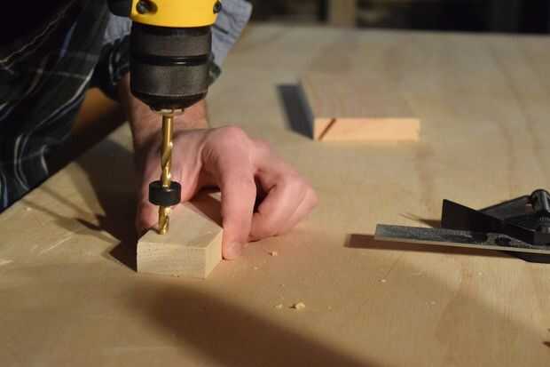 Para pasador, primero establece el tope del taladro, o bien un trozo de cinta aislante, para que la broca golpea una profundidad un poco más de mitad de la longitud de la espiga. Esto puede tomar algo de práctica en un pequeño trozo antes de encontrar ese punto dulce de altura en la broca.