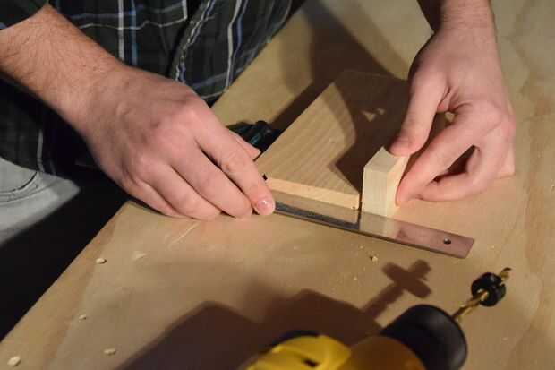 Ahora que tiene 3 orificios en el extremo de 1 x 4, coloque un pasador de centraje en el agujero del pasador. Alinee la vertical 1 x 2 para el 1 x 4 que es colocación plana con su escuadra de combinación y presionan firmemente entre sí para que el pasador puede dejar una marca. Ahora perfore un agujero en esa marca. Otra vez estando seguro es vertical.