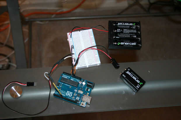 Con pin 7 de Arduino Uno como el pin de control para un motor de servo, instalé el bosquejo "servo.ino" para hacerlo correr. El servo es alimentado por cuatro pilas AA. Negativo de las baterías está ligada a la negativa en el Arduino. Funciona el Arduino con una batería de 9 voltios (con V).