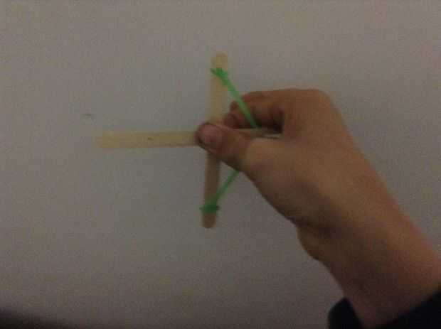 se necesita:-4 palitos-wire/clip-goma-hilo dentalPaso 1: Perforar agujeros taladré un agujero con una dremel, pero puede usar cualquier otra herramienta.Tenga cuidado de no romper el palito.Paso 2: montaje Paso 3: flechaPaso 4: Haga clic en el enlace