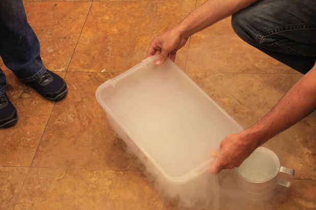 Mientras que sigue lejos de la burbuja, vierta algunas más LN2 en el recipiente más pequeño. Verter delicadamente un poco encima de tus paletas. Serán todos se evaporan, así que no te preocupes por consumir cualquiera - esto es solo para cosas congelan uniformemente por todos los lados.