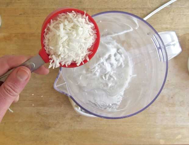 Añadir el 1/3 taza de coco rallado, todos de la ralladura de limón y 1/4 taza de azúcar a la licuadora.