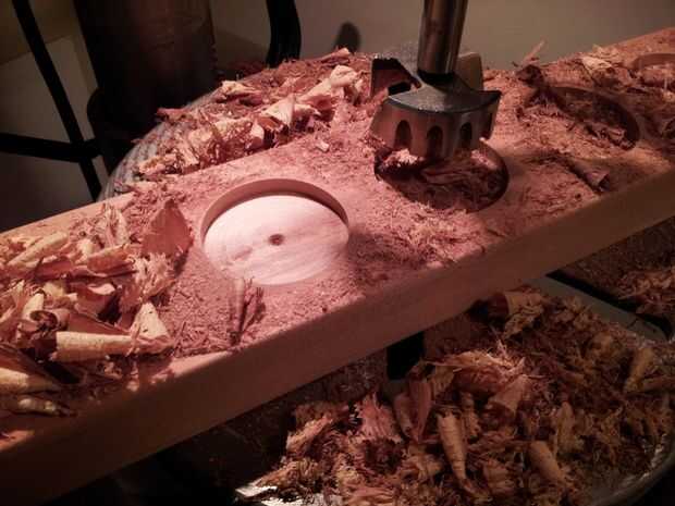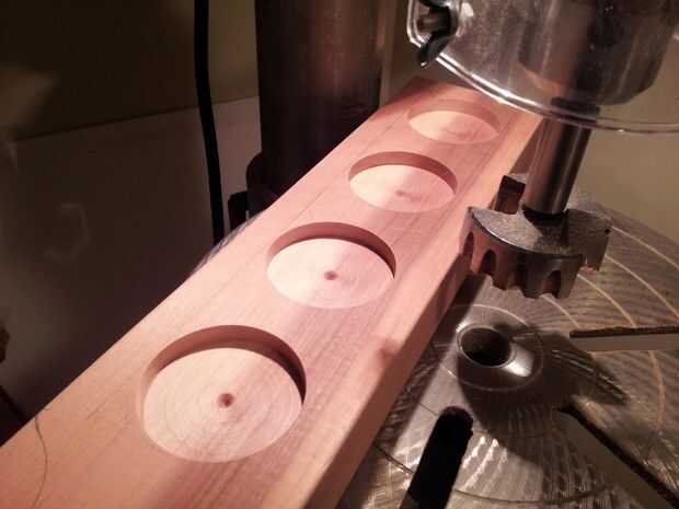 Utilizar una pieza Forstner de 2.25", medida cuando el centro de la broca toca la madera y bajar por 1/2". Terminarás con 4 cavidades agradables circular con un agujero minúsculo en el centro.