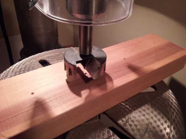 Lo primero que debe hacer aquí es perforar previamente el centro usando una 1/8" bits. Esto evitará que la broca Forstner centrada. No taladre a través de todo el camino. Sólo necesita bajar 1/2".