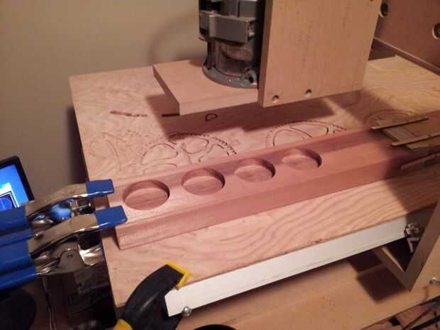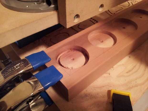 Esto puede hacerse con un router de mano. Como tengo una CNC, utilicé el ordenador para completar ese paso. Se necesita para medir la profundidad del agujero es (el tamaño de la punta del centro de la broca Forstner) y eliminar esta cantidad de madera.
