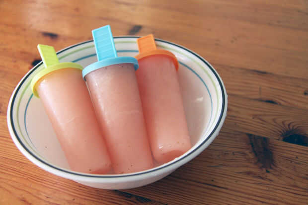 Estas paletas de daiquiri de fresa plátano son un verdadero placer en un caliente día de verano. Usted querrá comer para arriba rápidamente porque derrite un poco más rápido que el regular paletas, pero ten cuidado, que estas paletas contienen Ron! L