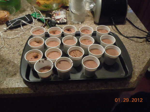 Vierta ingredientes mezclados en la pequeña dixie tazas 3/4 del camino completo, luego poner en el congelador.  Después de aproximadamente media hora de pegar los palitos en la taza. (De esta manera permanecerán verticales)