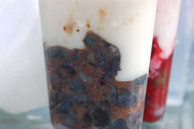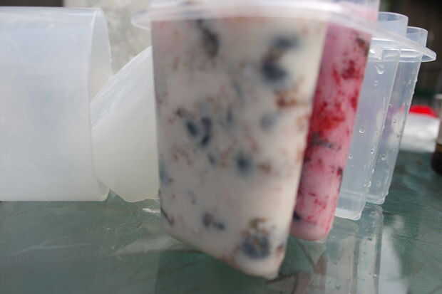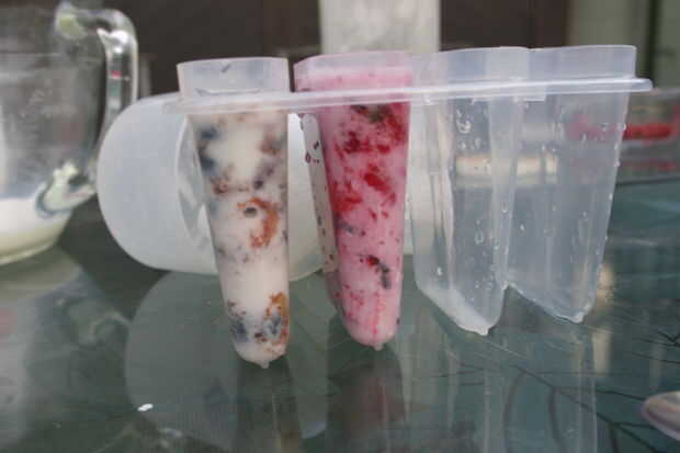Bruto. La leche aún no penetra en el lío de arándano. Un poco disgustado había mezclado las paletas y lanzó en el congelador.