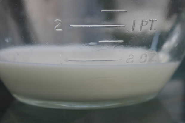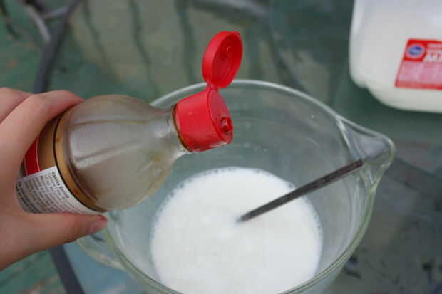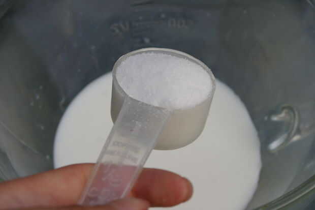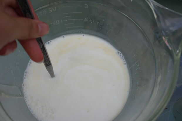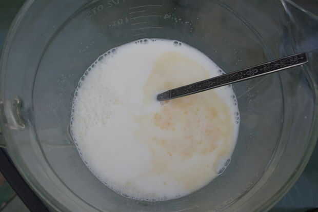 Mezclar todos los ingredientes en el vaso de medición. Esto es mucho más fácil, ya que no tienes que cambiar el contenedor en el que la leche es en y también es más fácil verter la base de los moldes.