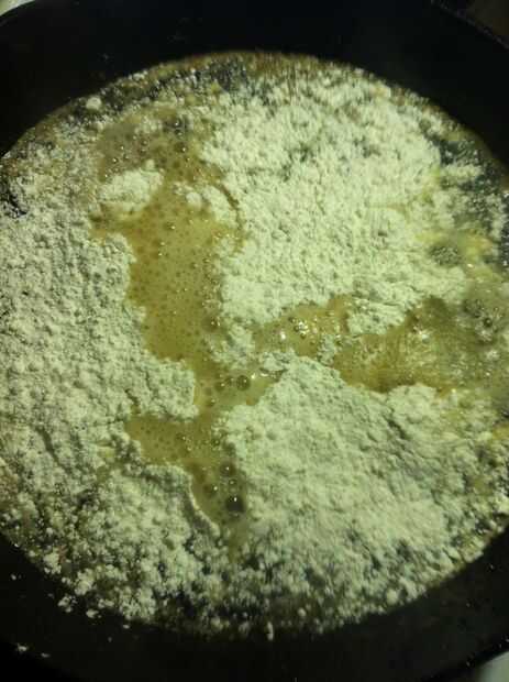 3. Espolvoree dos cucharadas colmadas de harina mientras se revuelve constantemente. (Aspersión reduce grupos). Como que espese poco a poco, agregar una taza de agua, leche, caldo o crema. Mantener revolviendo.