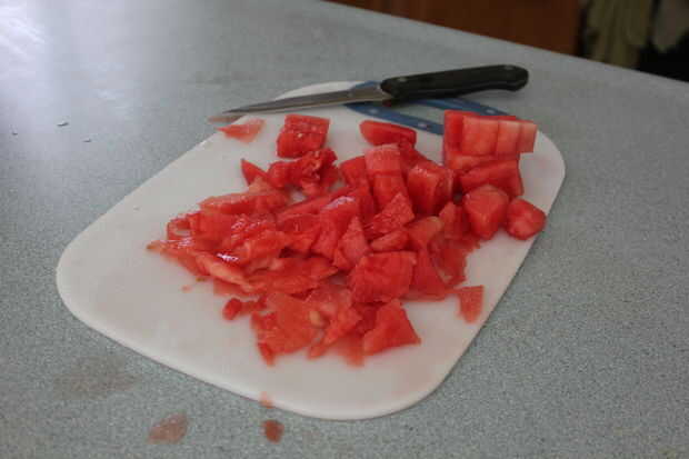 Cortar la sandía en trozos y luego en dados.